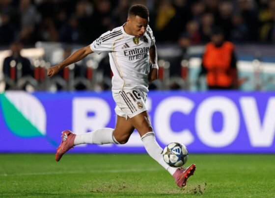 Com os três gols diante do Kairat, na vitória por 5 x 0 do Real Madrid, Kylian Mbappé subiu na…