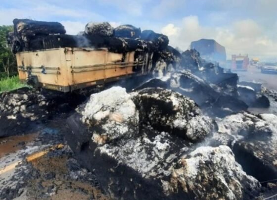 Carga de algodão é destruída por incêndio em bitrem na BR-163 em MT; Veja vídeo
