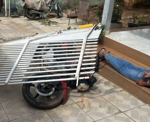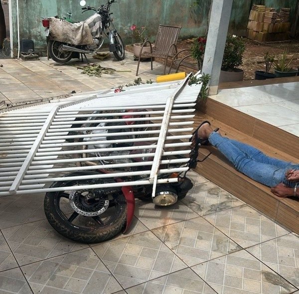 O motociclista derrubou o portão do imóvel com a moto e adentrou no quintal da casa. Após a contenção, os agentes iniciaram a verificação da procedência do veículo e constataram que a moto havia sido furtada do pátio da própria Guarda Municipal, no ano passado.