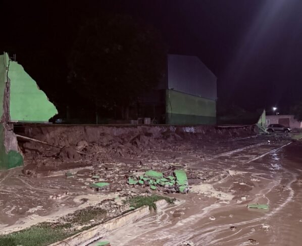 Após uma forte chuva na noite desta segunda-feira (2) em Coxim, o muro de uma escola estadual desabou e ruas ficaram intransitáveis pela cidade. Conforme a Prefeitura Municipal, foram 40,6 milímetros de água em apenas meia hora.
