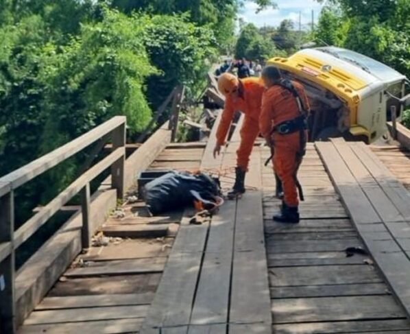 Ao chegar, os bombeiros constataram que um caminhão que transportava cascalho caiu no rio após a ponte de madeira por onde trafegava ceder.
