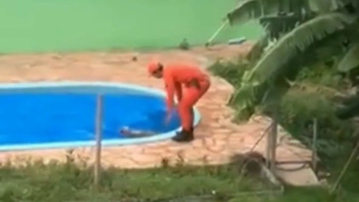 No interior da propriedade, os Bombeiros localizaram três cães. Ao acessarem a área da piscina, utilizaram uma rede de limpeza para retirar o animal da água.