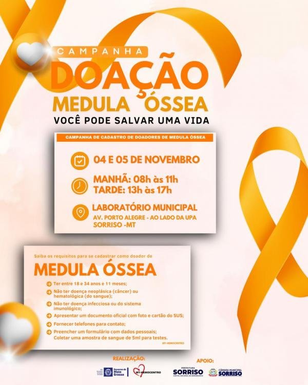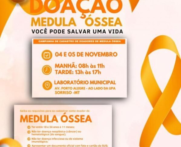 A solidariedade é a palavra-chave para os dias 04 e 05 de novembro, quando a Prefeitura e Câmara Municipal de Sorriso, em parceria com o MT-Hemocentro, promove a importante Campanha de Cadastro de Doadores de Medula Óssea. A iniciativa visa ampliar o Registro Nacional de Doadores Voluntários de Medula Óssea (REDOME) e aumentar as chances de pacientes em todo o país encontrarem um doador compatível, um passo crucial para o tratamento de doenças graves como leucemia, linfomas e alguns tipos de anemia.