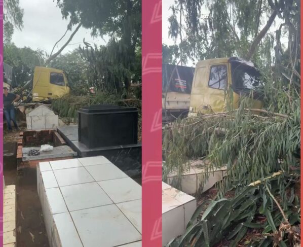 O motorista tenta entrar na cabine para segurar o veículo, sem sucesso. Dois trabalhadores que estavam em cima da carga pularam da carreta em movimento e, na sequência, ela invade o cemitério. Veja o momento abaixo: