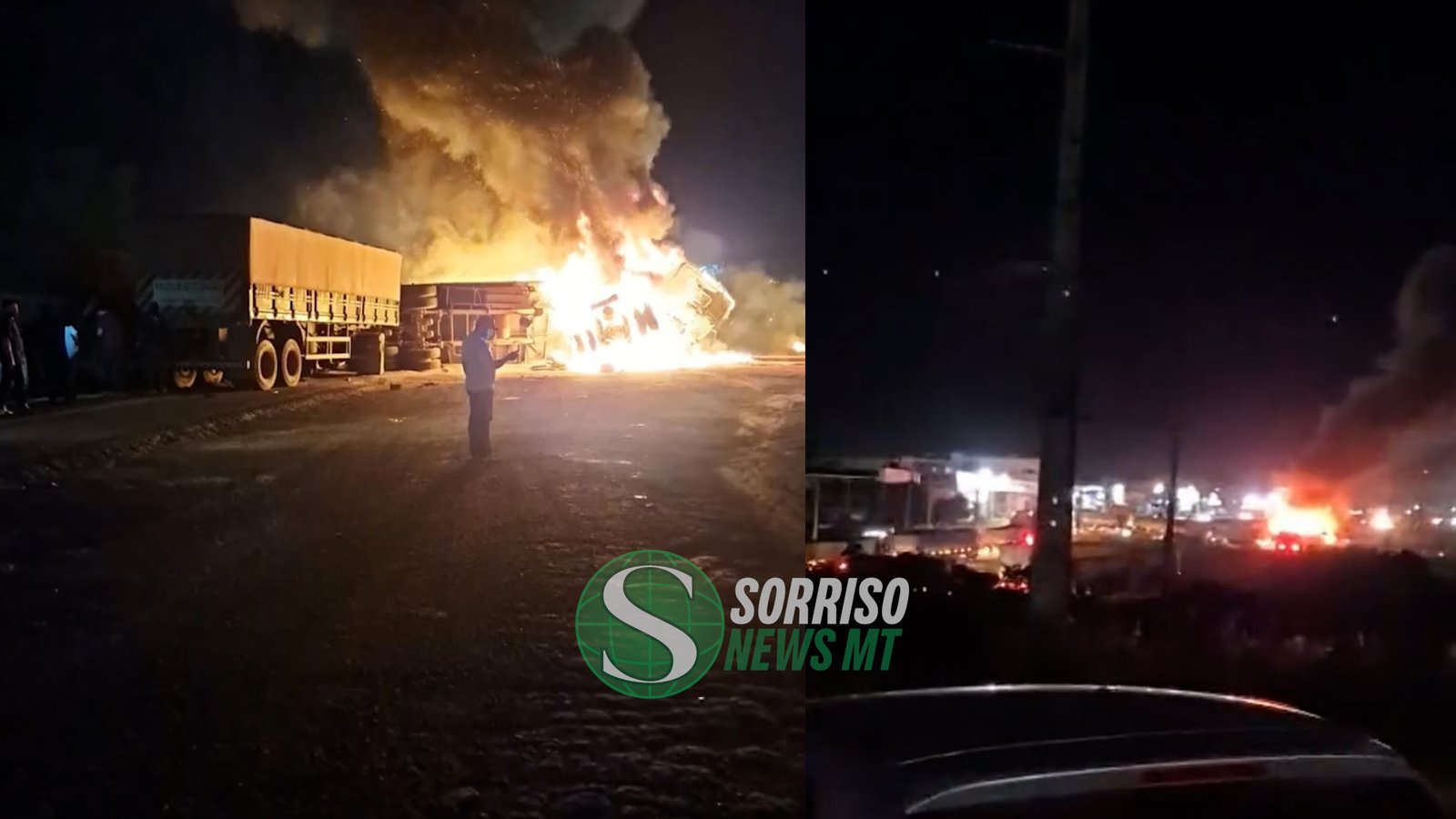 Imagens que circulam nas redes sociais mostram uma grande cortina de fumaça e altas labaredas de fogo consumindo duas carretas envolvidas em um grave acidente registrado na BR-163, no perímetro urbano de Matupá (a cerca de 685 km de Cuiabá).