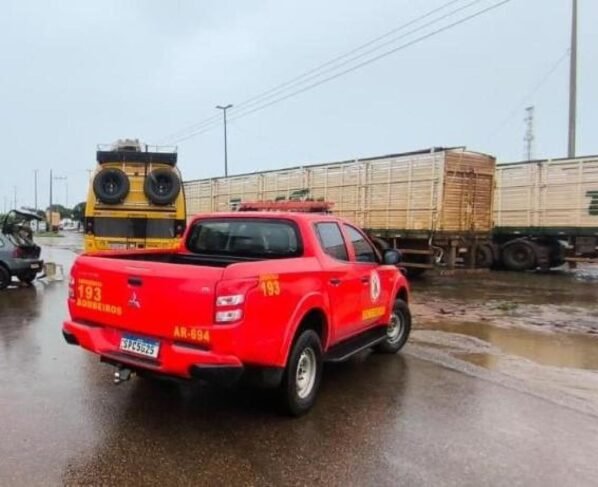 Em razão da gravidade do impacto, o condutor do caminhão ficou preso no interior da cabine, sendo necessária a utilização de equipamento desencarcerador para a abertura da porta e a retirada segura da vítima.