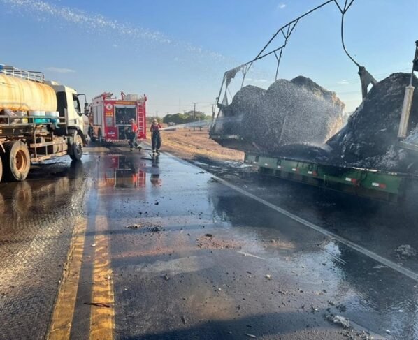 O Corpo de Bombeiros Militar de Mato Grosso (CBMMT) foi acionado, neste domingo (4.1), para combater um incêndio em uma carga de pluma de algodão transportada por uma carreta na BR-163, em Rondonópolis (a 219 km de Cuiabá).