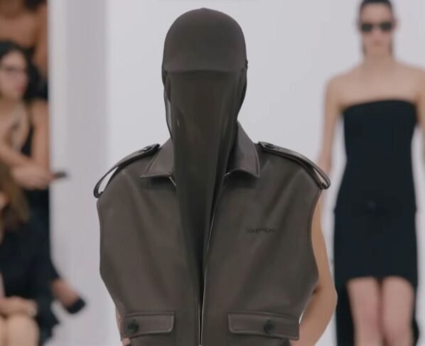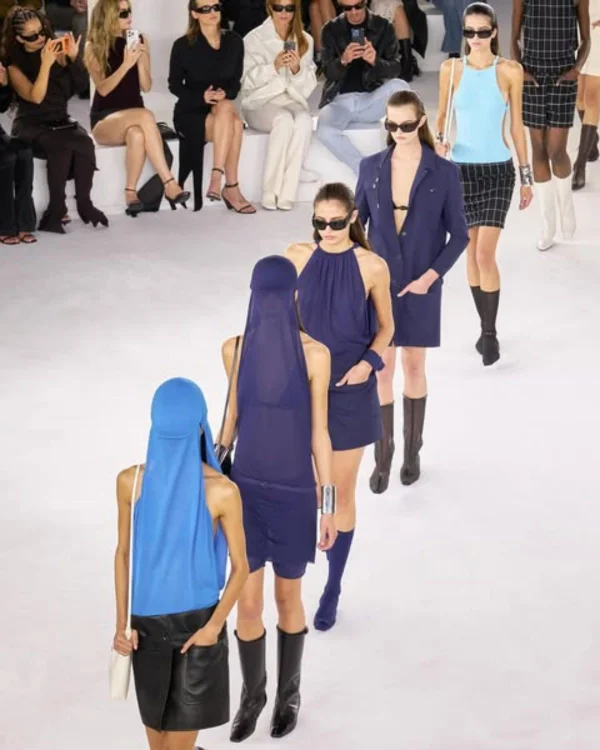 Inspirado em um verão que passou em Ibiza, na Espanha, o diretor criativo Nicolas Di Felice propôs uma coleção “preparada para o sol” no spring/summer 2026 da Courrèges. Para isso, além de montar um desfile com iluminação e temperatura propositalmente crescentes, com óculos escuros inclusos no convite, o estilista trabalhou peças que cobrem o rosto das modelos. Entre elas, tops estruturados com painéis até a altura dos olhos e bonés com véu por dentro da saia, descritos pelo WWD como inspirados em um item de arquivo da grife francesa.