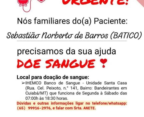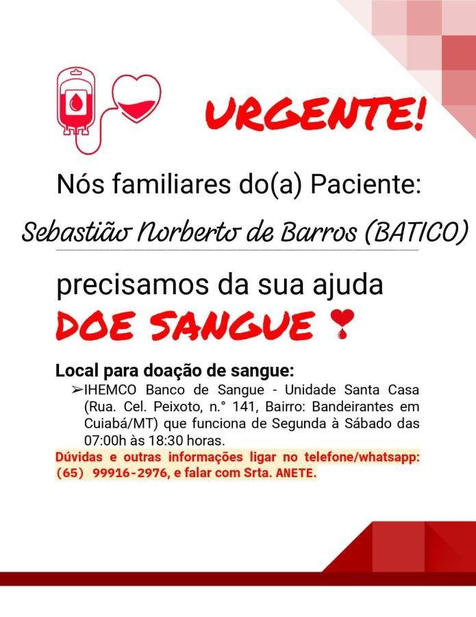 Familiares do ex-deputado estadual Sebastião Norberto de Barros, conhecido como Batico, divulgaram nesta terça-feira, 30 de setembro, um pedido urgente de doação de sangue. O apelo foi feito por meio das redes sociais e encaminhado à imprensa, destacando a necessidade imediata de voluntários.