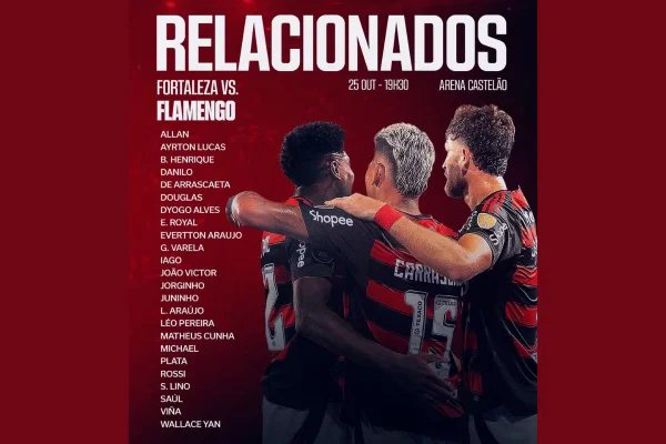 O Mengão divulgou nesta sexta-feira (24/1o) a lista de relacionados para o confronto. Cebolinha e Pedro seguem em recuperação no departamento médico. Erick Pulgar e Carrascal estão suspensos por cartão. Flamengo justificou a ausência de Nico De la Cruz devido a um quadro de virose nessa semana.