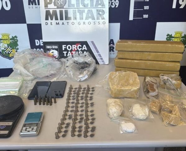 Policiais militares da Força Tática do 3º Comando Regional prenderam um homem, de 28 anos, e apreenderam um adolescente, de 15 anos, por tráfico ilícito de drogas, na tarde deste sábado (10.1), em Sorriso. Com os suspeitos, foram apreendidas tabletes e porções de maconha, cocaína e munições de calibre .32