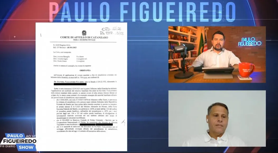 Em entrevista a Paulo Figueiredo, Eduardo Tagliaferro relatou ter sido notificado, hoje, pela polícia italiana sobre um pedido de prisão feito pelo ministro Moraes no mesmo dia em que concedeu uma entrevista a Allan dos Santos, em 31 de julho. Já em meados de agosto, sua extradição foi formalmente solicitada — uma semana antes da denúncia apresentada pela PGR.