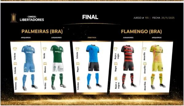 Os uniformes da final da Libertadores 2025 estão definidos. A Conmebol anunciou quais serão as combinações que Flamengo e Palmeiras irão usar no jogo decisivo da competição. Diferentemente da decisão de 2021, o time carioca irá de camisa e meião rubro-negros, com calção preto. Já o Alviverde jogará com a camisa e o meião verdes e o shorts branco.
