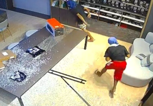 Imagens do sistema de monitoramento registraram o momento em que os criminosos arrombam a porta de vidro, que se estilhaça ao atingir uma mesa com expositores. Em seguida, o trio entra rapidamente na loja, recolhe diversos acessórios, abre caixas para retirar mercadorias e ainda leva dois aparelhos celulares pertencentes a clientes, que estavam no local para conserto e manutenção.