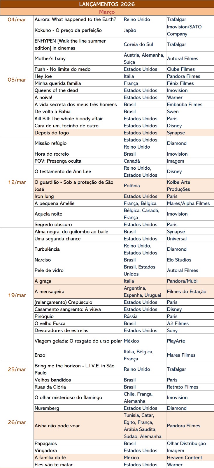 Na onda dos relançamentos, o mês tem Kill Bill: The whole bloody affair (05/03), que une as duas partes de Kill Bill numa sessão de mais de quatro horas, e Crepúsculo (19/03), celebrando os 20 anos de publicação do romance de Stephanie Meyer. Ambos têm distribuição da Paris.