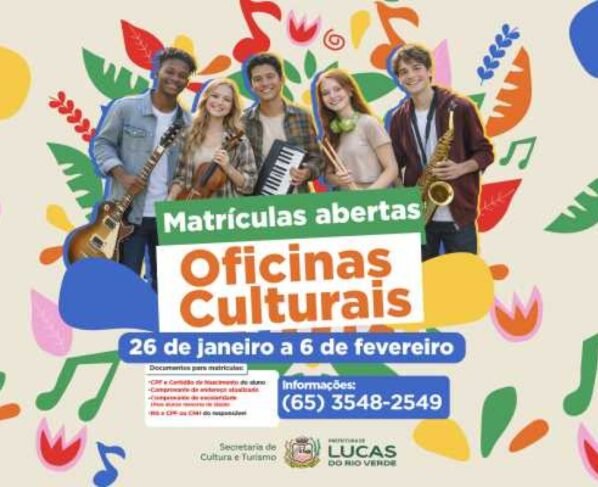 A Prefeitura de Lucas do Rio Verde, por meio da Secretaria de Cultura e Turismo, informa que estão abertas as matrículas para as Oficinas Culturais 2026. Os interessados podem se inscrever até o dia 6 de fevereiro, exclusivamente pela internet, por meio do link: