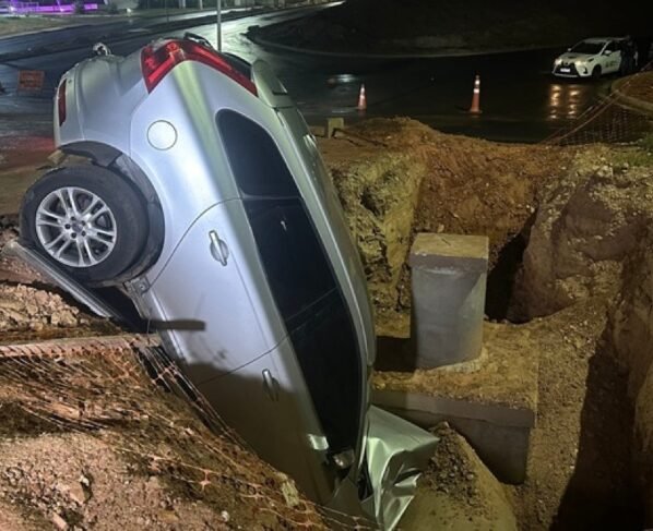 Motorista perde controle e cai com carro em buraco de avenida