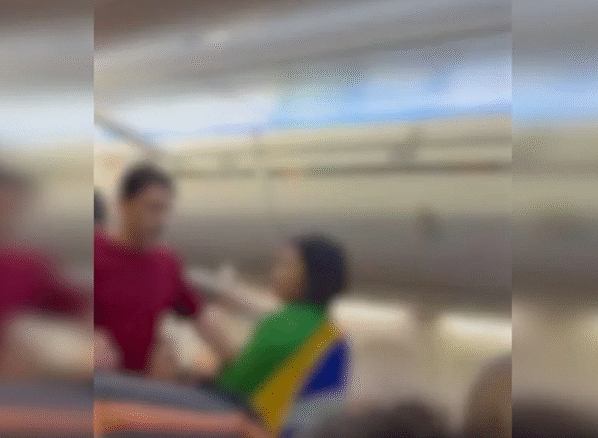 Vídeos obtidos pelo portal Metrópoles mostram a mulher enrolada em uma bandeira do Brasil e proferindo ofensas contra outros passageiros. “Estuprador, abusador, aliciador, assediador”, disse.