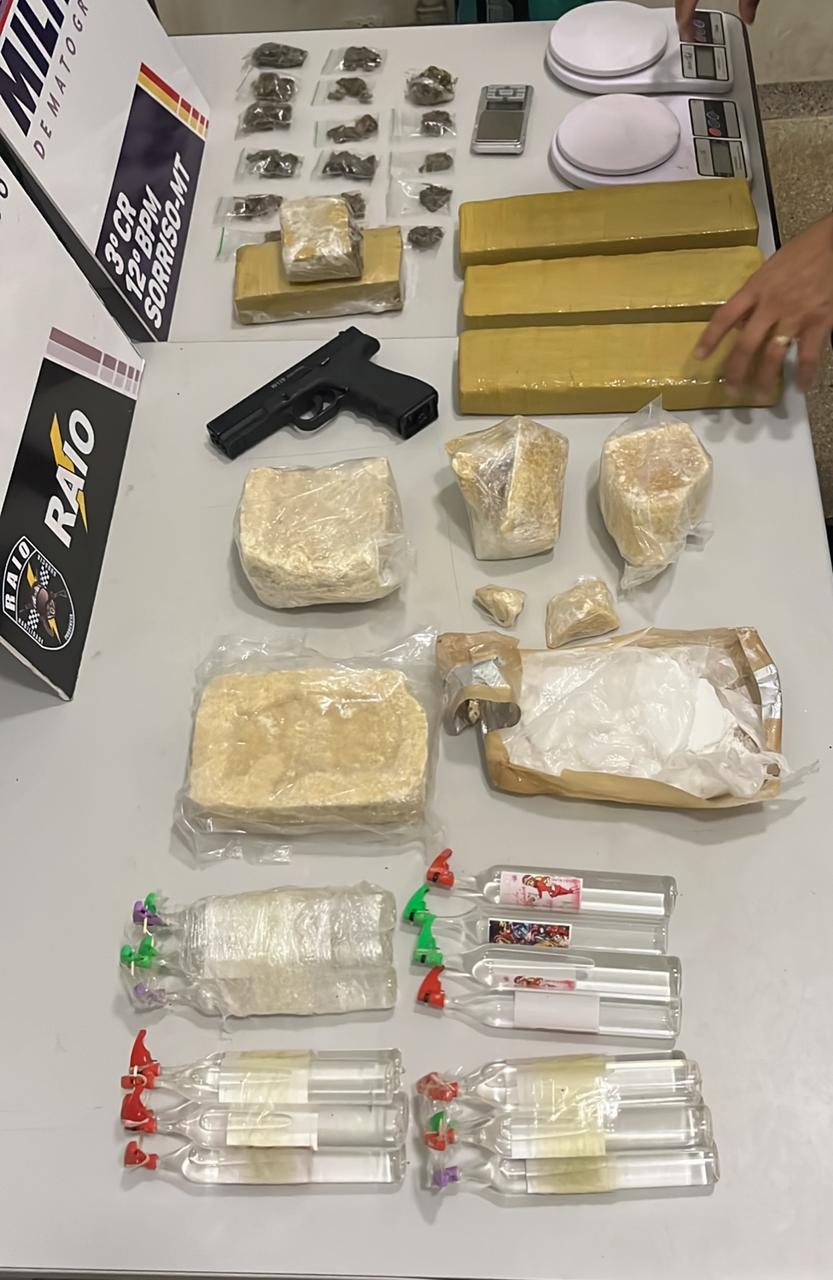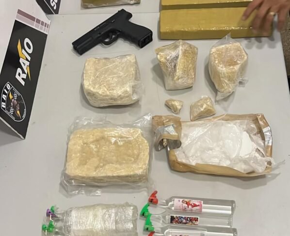 Durante a ação, os policiais localizaram grande quantidade de drogas e materiais ilícitos em diferentes cômodos do imóvel, incluindo cocaína, pasta base, maconha, lança-perfume, balanças de precisão, materiais para embalo e um simulacro de arma de fogo.