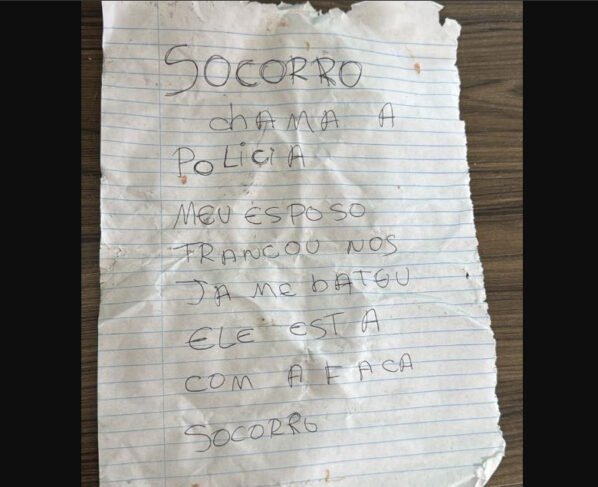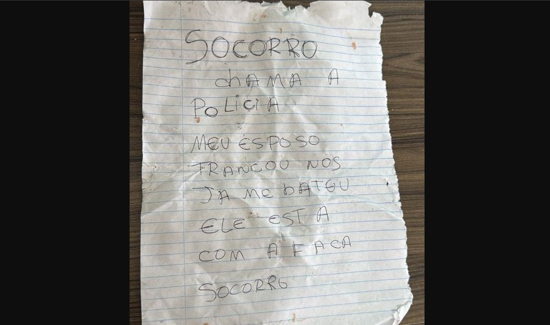 Os policiais militares foram acionados para atenderem a uma ocorrência de possível sequestro em uma residência no bairro Vida Nova II. No local, os militares encontraram um bilhete com a seguinte mensagem: “Socorro, chama a polícia. Meu esposo nos trancou e já me bateu. Ele está com uma faca. Socorro”.