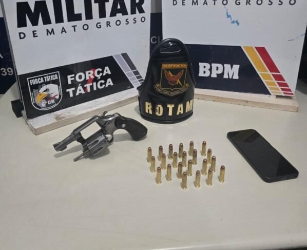 Diante da denúncia, militares da Força Tática e da Rotam se deslocaram até o local informado e identificaram os suspeitos. Durante abordagem, o suspeito foi flagrado com um revólver calibre .38, com seis munições e outras 16 munições em seu bolso.