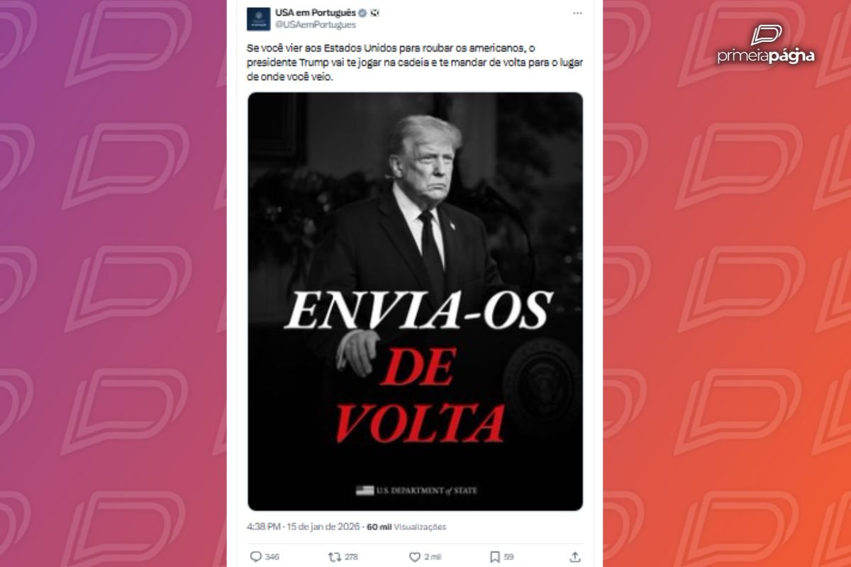 O Departamento de Estado dos Estados Unidos publicou, em seu perfil oficial em língua portuguesa, uma mensagem com tom de ameaça direcionada a imigrantes que pretendem entrar no país. A postagem traz uma imagem do presidente Donald Trump acompanhada da frase ‘Envia-os de volta’.
