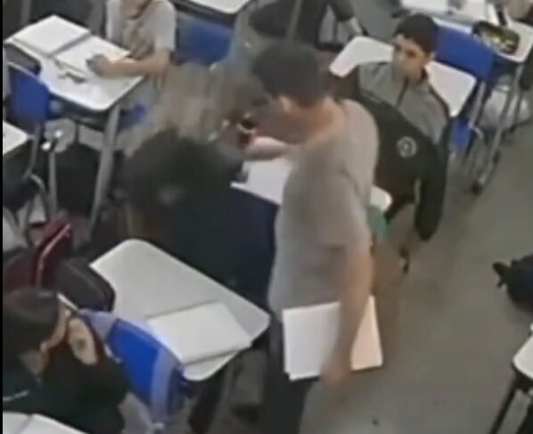 Nas imagens, o educador aparece esbarrando na mochila, recolocando-a no lugar e, em seguida, batendo diversas vezes na mesa do estudante. Logo depois, ele parte para a agressão física, desferindo tapas contra o aluno, que tenta se proteger com o braço e se afasta.
