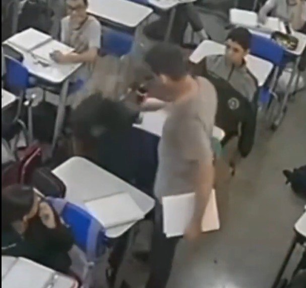 Uma cena de agressão dentro de uma sala de aula em Quirinópolis (GO) chamou a atenção nas redes sociais. Um professor foi flagrado dando vários tapas em um aluno após tropeçar em uma mochila no chão.