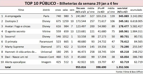A quinta semana de 2026, sem grandes estreias, teve A empregada (Paris) como líder — é a terceira semana seguida de liderança do longa—, seguido de Zootopia 2 (Disney) e de Avatar: Fogo e cinzas (Disney).
