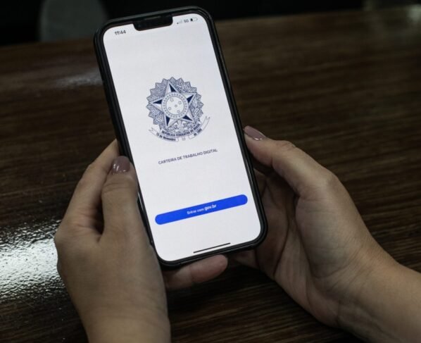 A imagem que acompanha a matéria mostra uma pessoa segurando um smartphone com a tela do aplicativo da Carteira de Trabalho Digital (CTPS Digital) aberta, exibindo o emblema nacional brasileiro e o botão azul “Entrar com gov.br”.