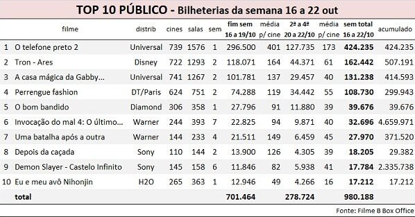 O principal responsável pelos números foi O telefone preto 2 (Universal), mostrando que o resgate de marcas de terror conhecidas pelo público está fazendo muito bem para o gênero este ano. Com mais de 420 mil vendidos, a sequência teve um desempenho bem superior à semana de abertura do longa original, de 2022 (340 mil ingressos).