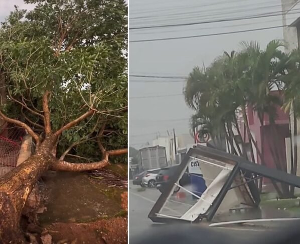 Além das árvores, o temporal também provocou prejuízos em estruturas urbanas, como fachadas de estabelecimentos comerciais, placas de sinalização e tapumes de obras, que não resistiram à força do vento.