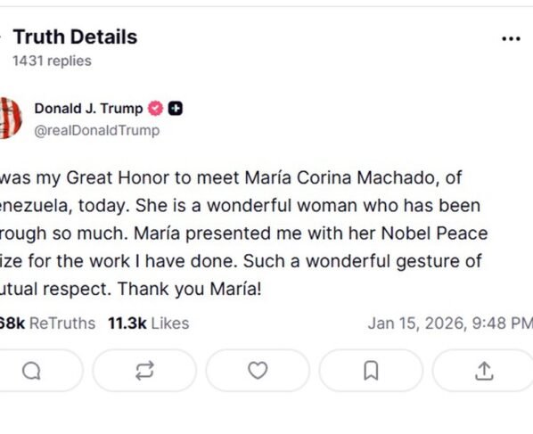A líder da oposição venezuelana, María Corina Machado, entregou sua medalha do Prêmio Nobel da Paz ao presidente dos Estados Unidos, Donald Trump, nesta quinta-feira, durante uma reunião na Casa Branca, em uma tentativa de ganhar influência sobre como o presidente moldará o futuro político do país sul-americano. Um funcionário da Casa Branca confirmou que Trump pretende ficar com a medalha. Em uma postagem em rede social na noite de quinta-feira, Trump escreveu que María o presenteou com seu Nobel pelo trabalho que ele realizou, descrevendo o ato como um gesto maravilhoso de respeito mútuo. Machado, que classificou a reunião como “excelente”, afirmou que o presente foi um reconhecimento ao compromisso de Trump com a liberdade do povo venezuelano.